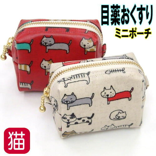 ミニポーチ 目薬・おくすりポーチ ミニサイズ ネコ柄 ニャンニャン コインケース 小物入れ コスメポーチ PVC加工 レッド/アイボリー(猫 雑貨 小物 グッズ ねこ ネコ 猫柄 猫雑貨 猫グッズ 女性 レディース かわいい おしゃれ ギフト包装無料)